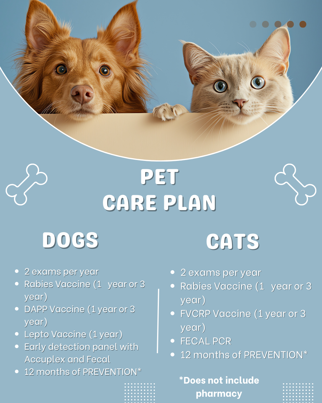 Annual exam, bi-annual wellness exam, core vaccines, 12 months of flea/heartworm/tick/intestinal parasite prevention, and routine bloodwork once or twice a year (depending on the plan chosen).